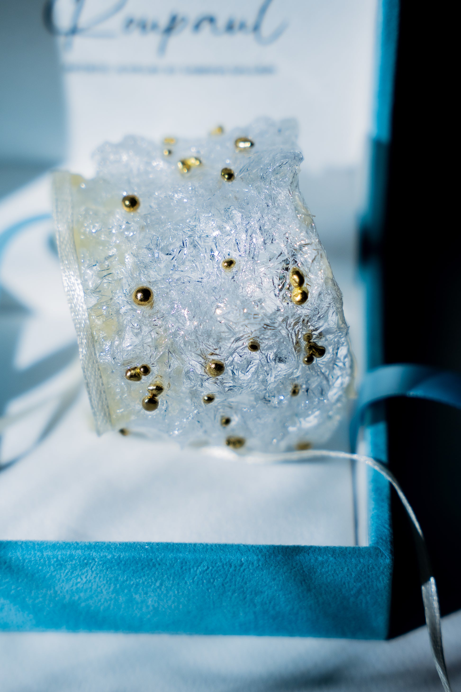 Bracciale realizzato interamente a mano, caratterizzato da trasparenze luminose effetto vetro che catturano la luce con estrema delicatezza.